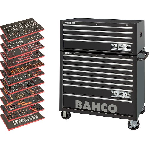 Pakke bestående av verktøyvogn og overskap med totalt 12 skuffer, hvorav 11 med totalt 754 verktøy. Med slitesterkt rustsikkert pulverlakk. Ekstra forsterkede doble vegger gjør at skuffene kan åpnes selv om vognen er bulket. Myke gummihjul, hvorav to har bremser. Komfortabelt håndtak som kan festes på begge sider av vognen. Helt åpne skuffer som ikke glir ut av seg selv når vognen flyttes. Forberedt for tilbehør. Bahco innsatser med verktøy og BETMS-løsninger passer i skuffene.