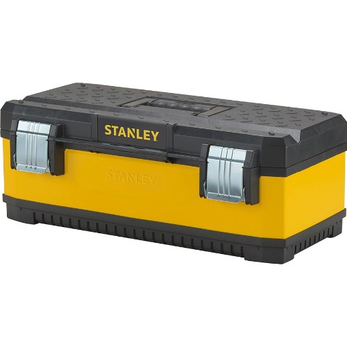 Verktøykasse i plast og robust metall. Med store, rustfrie metallspenner med hengelåsløkke. Ergonomisk håndtak i bi-materiale. Et stort rom og bærbart brett med bærehåndtak. V-spor i lokket.