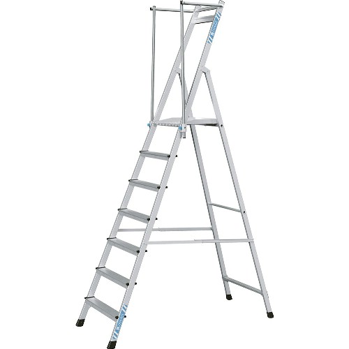 Plattformstige med sammenleggbart rekkverk. 80 mm dype trinn og stor plattform på 400x400 mm med sparklist. Høyt rekkverk på 1000 mm. Robust takket være forsterket støtte, godkjent i henhold til "Godt arbeidsmiljøvalg".