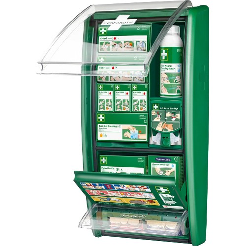 Førstehjelpsstasjon med produkter for de fleste typer skader som forbrenningskompresser, øye- og sårvaskespray, blodpropper og plaster. Stasjonen kan enkelt tilpasses ulike omsorgsbehov. Nå med en integrert dispenser som inneholder Cederroth Soft Foam Bandage Beige (2 meter). Tydelige og lettfattelige førstehjelpsinstruksjoner er trykt på stasjonen og på produktemballasjen.