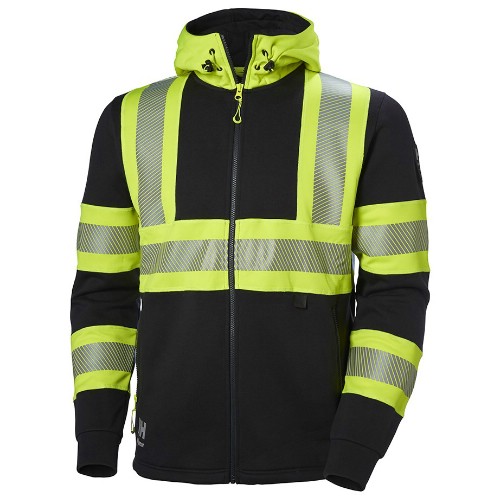 Slitesterk hettegenser i varselfarge. YKK glidelås midt foran. Hette med snorjustering. Håndlommer med YKK glidelås. Justerbar nedre kant med strikk. Hempe for ID-kort. 3M refleks striper. Vaskes 40°C.