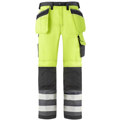 Håndverksbukse med varsel og avansert snitt. Tre refleksstriper på baksiden av bena. Knebeskyttelseslommer designet med ekstra materiale foran for økt komfort. Lett tilgjengelig benlomme med separat mobillomme og fire penne-/verktøyrom. Tomstokklomme designet med løse hjørnefliker. Vaskes på 60°C.