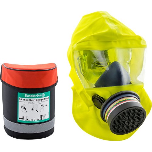 Rømningshette med filter for evakuering ved kjemikalieulykker. Filtrerende åndedrettsvern i kombinasjon med hette for bruk under evakuering ved kjemikalieulykker. Hetten er basert på Sundströms halvmaske i silikon, som er montert i en hette laget av kjemikaliebestandig materiale. Hetten er vakuumpakket i en aluminiumspose. Hetten kan raskt og enkelt settes på uten forutgående justering. Utstyrt med kombinasjonsfilter SR 299-2 ABEK1-Hg-P3. Filterkombinasjonen beskytter mot alle typer partikler og følgende typer gasser: A1, organiske gasser og damper, for eksempel løsemidler, hvis kokepunkt overstiger +65°C. B1, uorganiske gasser og damper, f.eks. klor, hydrogensulfid og hydrogencyanid. E1, sure gasser og damper, f.eks. svoveldioksid og hydrogenfluorid. K1, ammoniakk og visse aminer, f.eks. etylendiamin. Hg, kvikksølvdamp. Levetid 10 år. Godkjent som bærbar flukthette og leveres i en fleksibel nylon nødveske, som for eksempel kan festes til beltet.
