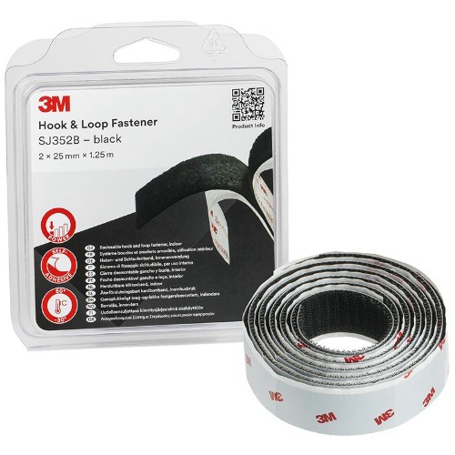 Selvklebende borrelåsteip av høy kvalitet med aggressiv gummifestemiddel. Fester seg på mange ulike overflater, også pulverlakkert og plast med lav overflateenergi som polyetylen og PVC. For innendørs bruk. Temperaturbestandighet -30°C til +50°C.
