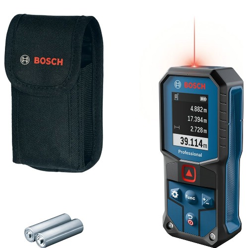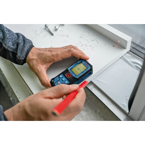 Allsidig avstandsmåler med rød laser. Syv målemoduser og automatisk beregning av lengde, areal og volum. Minnefunksjon for de 10 siste målingene. Enkel å bruke med intuitivt tastatur og lyssterk fargeskjerm. Robust design med støtdempende hus som tåler fall fra opptil 1,5 meters høyde. Drives av 2 x 1,5 V LR6 (AA)-batterier. Kompatibel med Li-Ion-batterier.