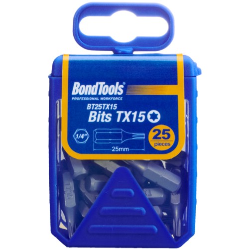 Bits for Torx-spor med 1/4" bitsfeste, 25 stk i plastboks. Lengde 25 mm. Materiale S2.