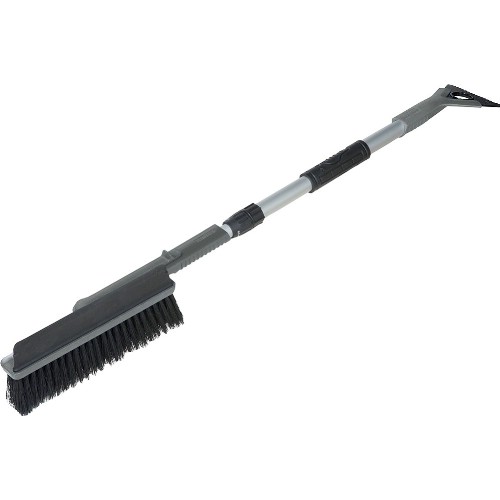Snøbørste for bil med isskrape. Innovativ børste med et roterbart børstehode med integrert gummiskrape. Børsten og gummidelen kan låses i to forskjellige posisjoner, i T-posisjon eller parallelt med akselen. Kraftig teleskopskaft for ekstra lang rekkevidde. Gummidelen fjerner effektivt våt og tung snø. På skrapedelen er det et hakk for å fjerne is fra vindusviskerne. Den vendbare skrapeseksjonen gjør at du alltid har en ny skrapeside å bruke. Børsten er laget av PET-plast fra resirkulerte vannflasker.